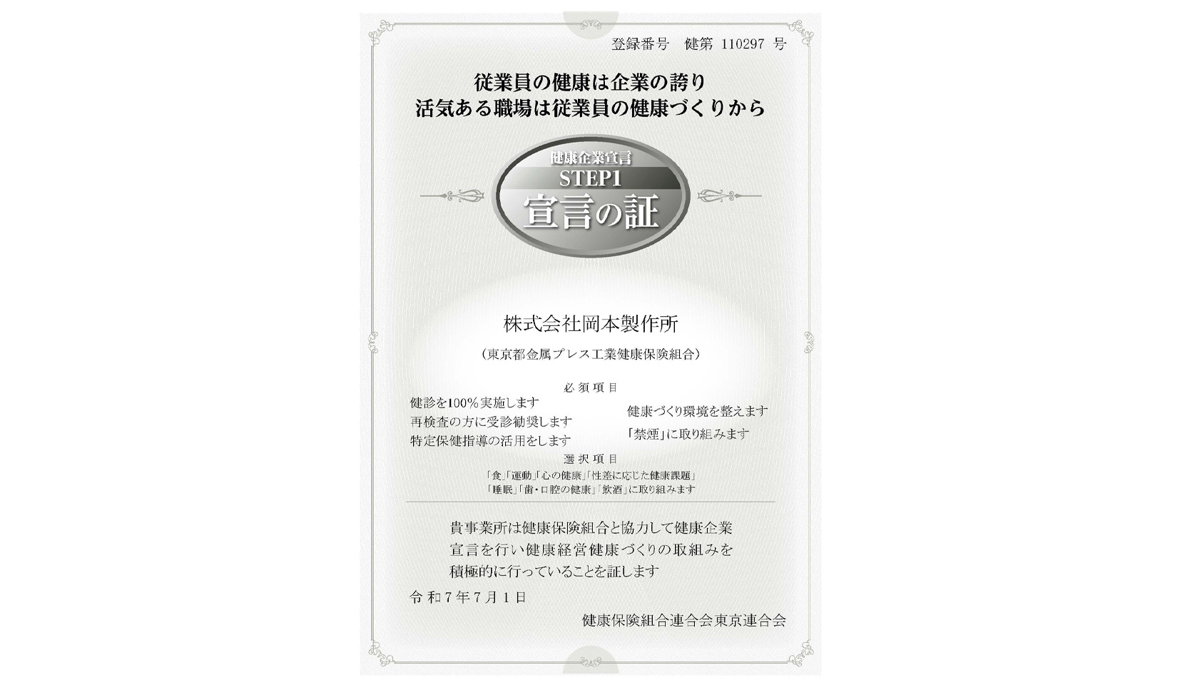 当社は令和7年7月1日付で「健康企業宣言」を行い、社員の健康保持・増進に向けた取り組みを本格的に開始しました。 現在、健康経営の推進体制を整え、銀の認定取得に向けて活動を進めております。 社員一人ひとりが心身ともに健やかに働ける環境づくりを目指し、今後も継続的な改善と取り組みを行ってまいります。